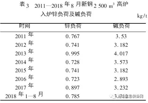 2013 年,新鋼2 500 m3 高爐入爐鋅負(fù)荷、堿負(fù)荷分別高達(dá)0. 995 kg /t 和4. 017 kg /t( 見表3) ,遠(yuǎn)遠(yuǎn)高于國(guó)標(biāo)要求。高爐90% 以上的鋅負(fù)荷和60% 左右的堿金屬負(fù)荷來(lái)自燒結(jié)礦,這也是爐料結(jié)構(gòu)中高比例燒結(jié)礦給高爐生產(chǎn)帶來(lái)的新問題,同時(shí)也是近年來(lái)新鋼兩座2 500 m3 高爐有不同程度結(jié)厚的重要原因。近年來(lái)新鋼2 500 m3 入爐鋅負(fù)荷、堿負(fù)荷情況見表3。
